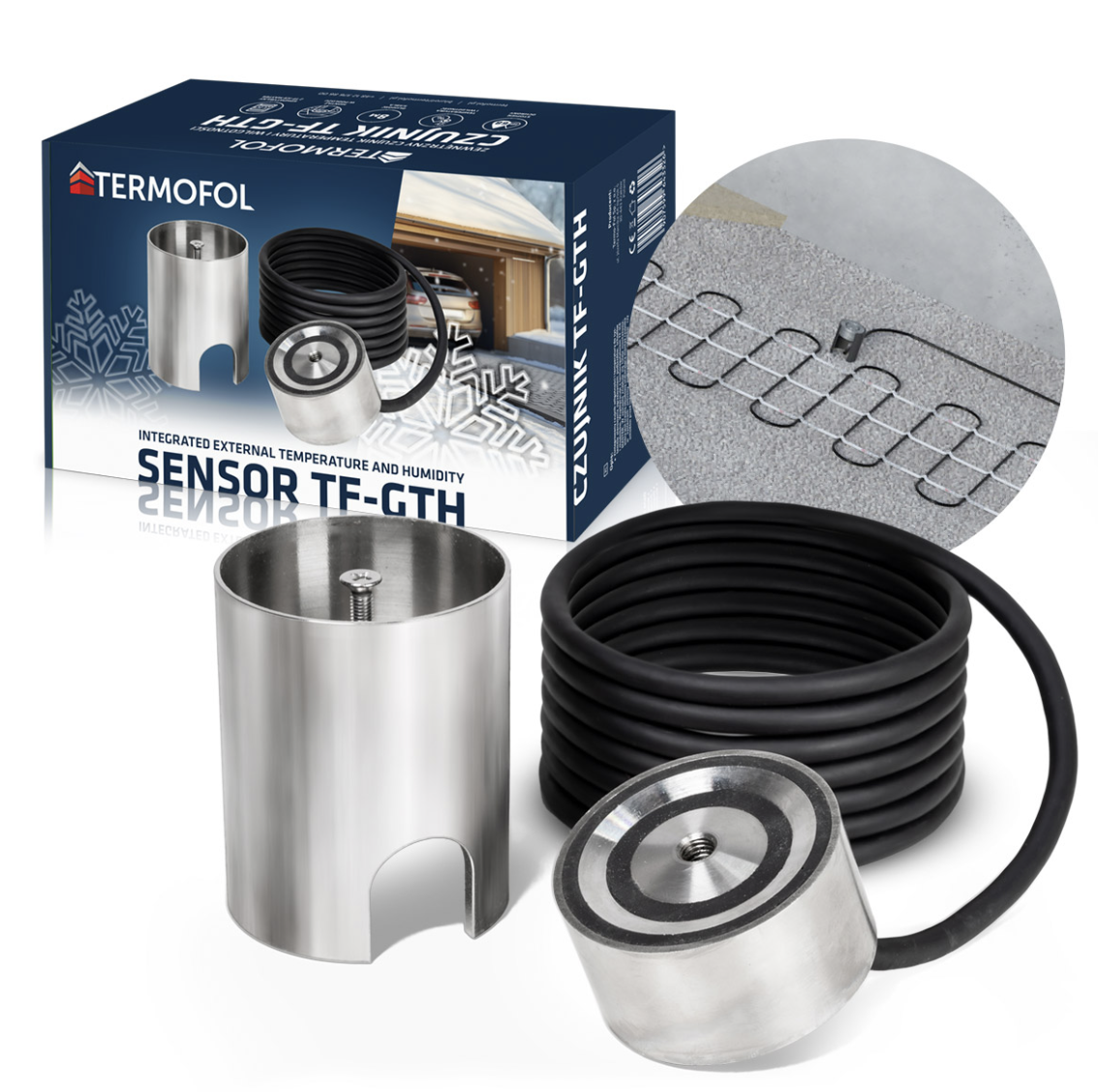 TF-GTH je integrovaný čidlo teploty a vlhkosti, navržené speciálně pro použití v systémech ochrany proti námraze u venkovních ploch, jako jsou příjezdové cesty, schodiště a chodníky.